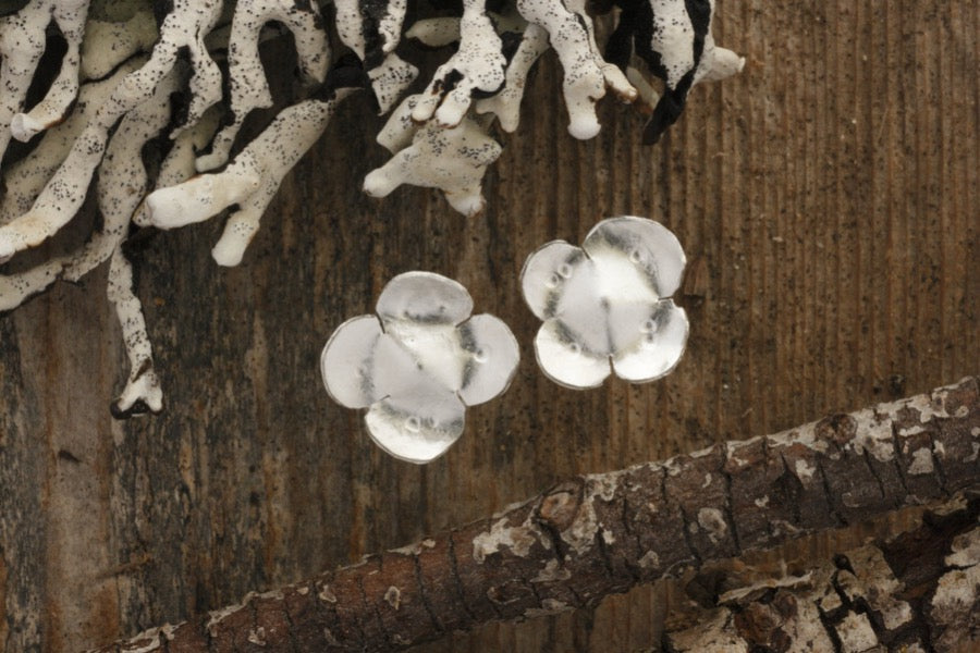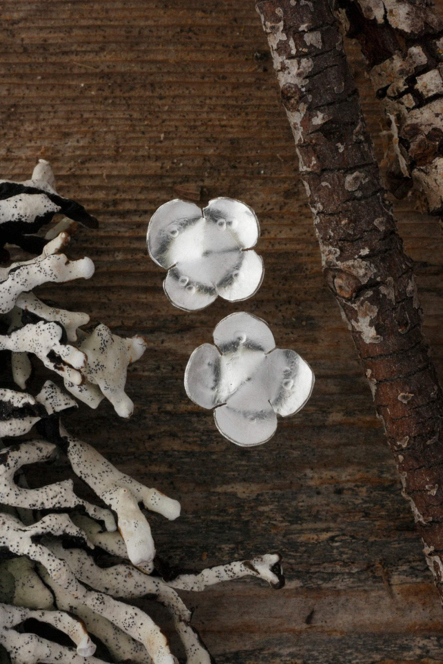 Earring studs made of reclaimed Sterling Silver with new Sterling posts. Hand formed flowers measure 11.5 mm across.