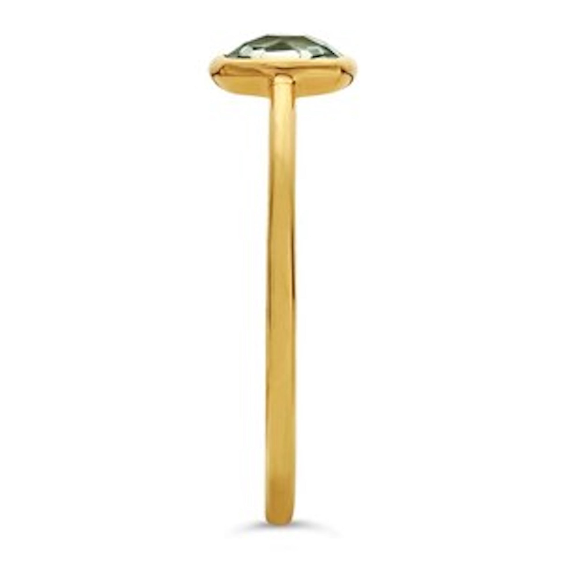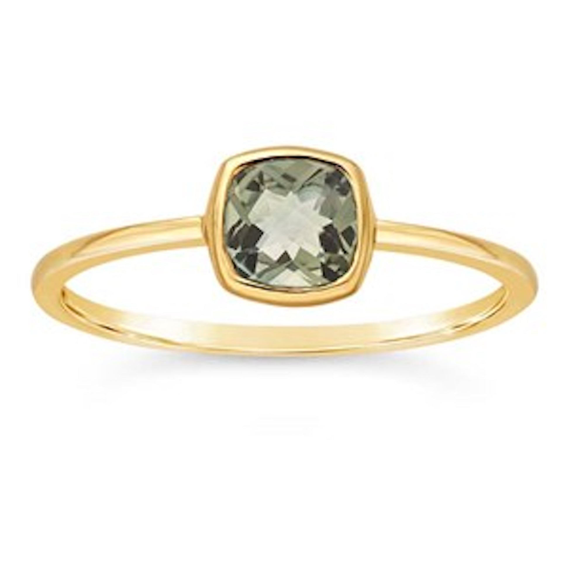 A beautiful, cushion cut, green amethyst ring set in recycled solid 14 K yellow gold. Can be worn as stacking ring or solitaire. Note- natural gemstone color varies and may be lighter than the photo.