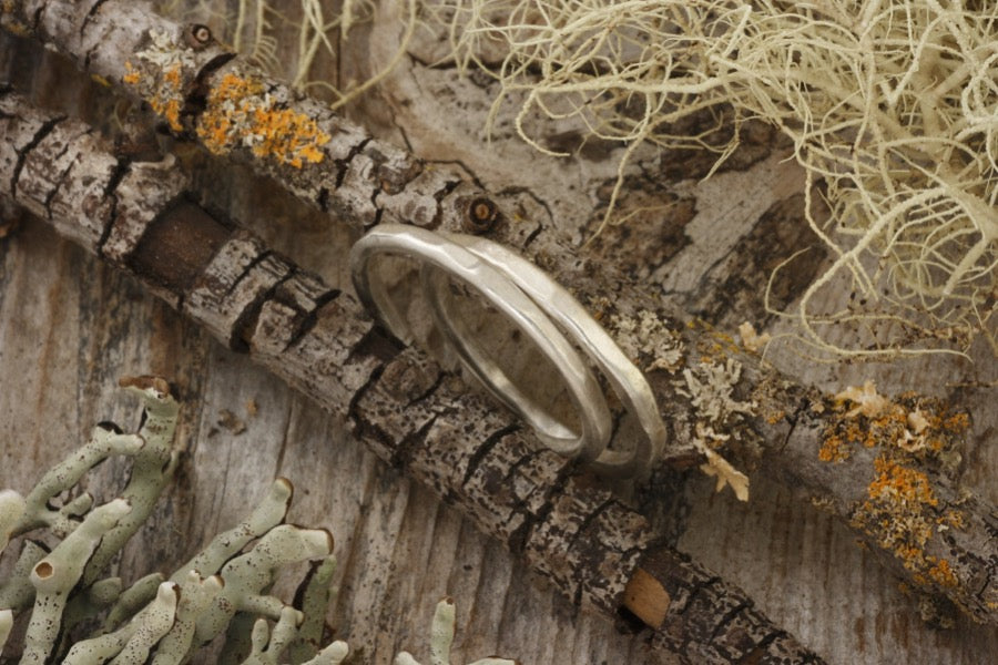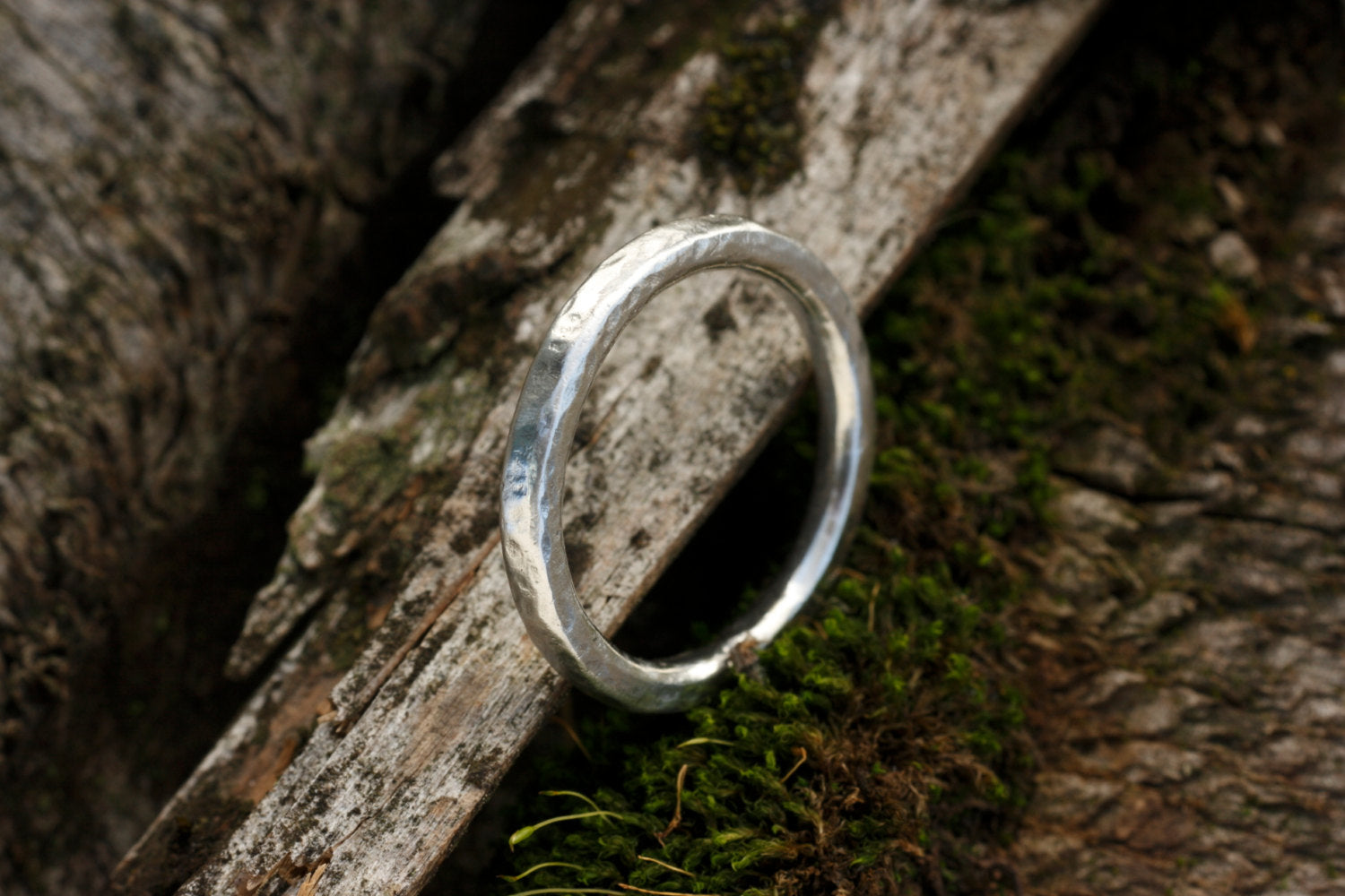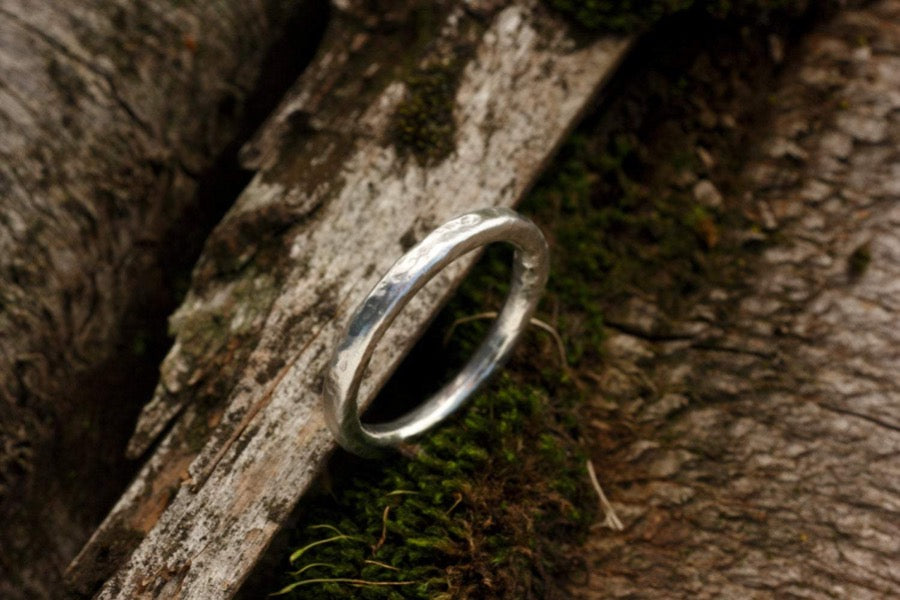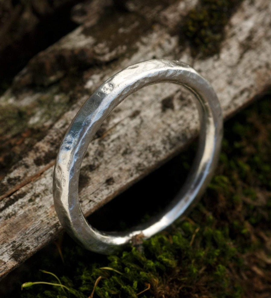Custom made in your size. Wedding band is handmade of reclaimed Fine Silver, with a hammered surface.